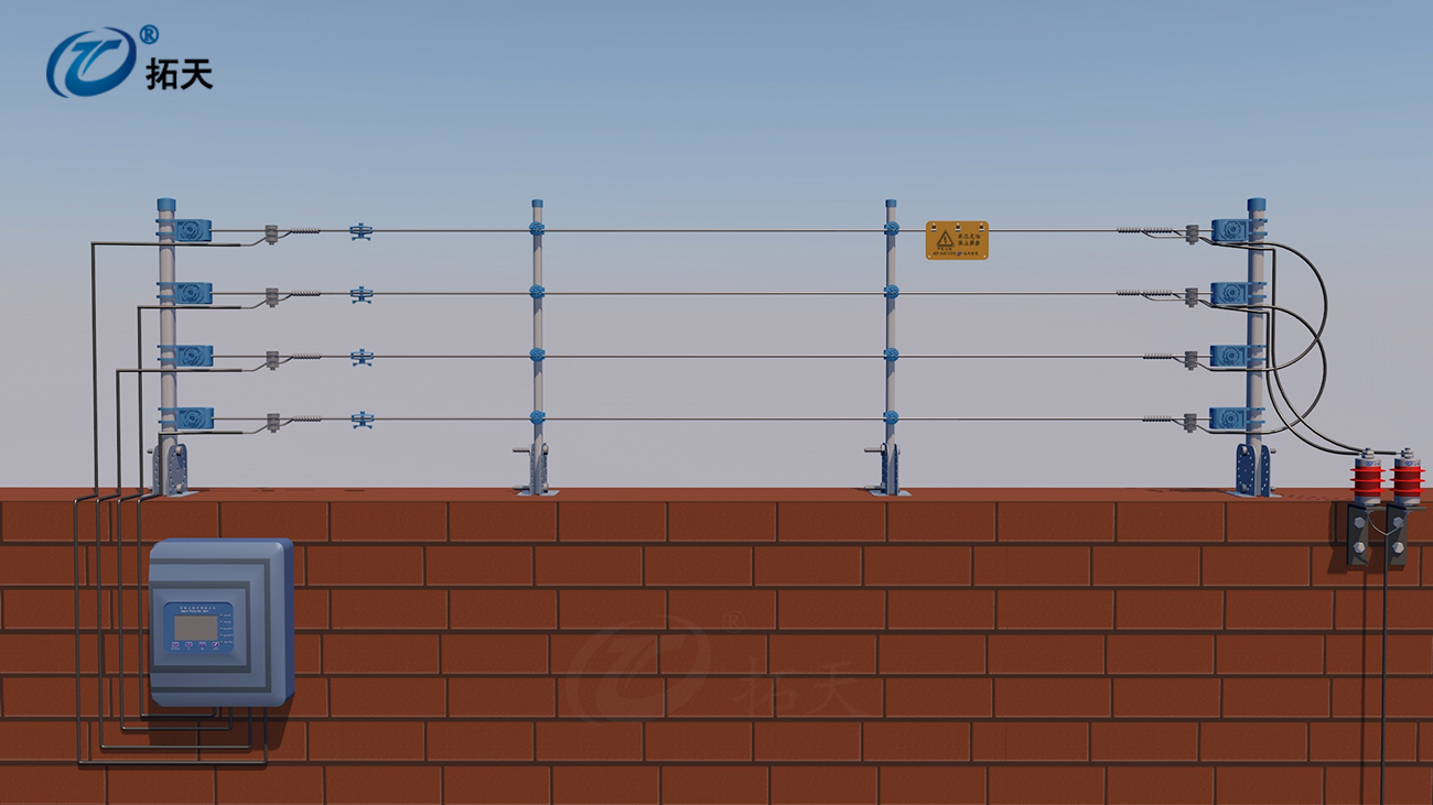 3、現(xiàn)前端圍欄上每根線每個點都有3000V-5500V高壓脈沖電,讓入侵者無機可乘
