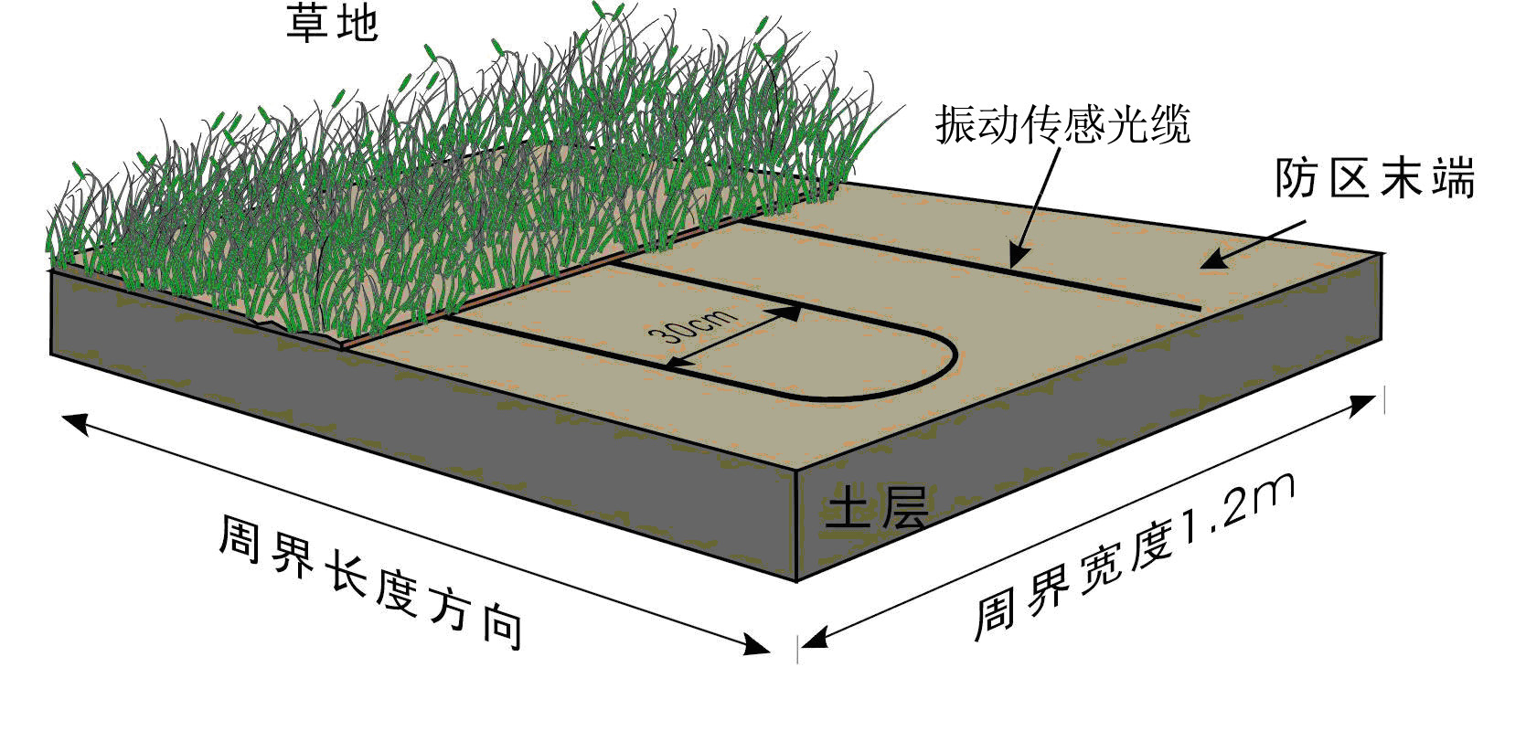 在沙土地下埋設(shè)振動(dòng)傳感光纜時(shí),也采用平行鋪設(shè)多道振動(dòng)傳感光纜的鋪設(shè)方式,但由于沙土比較松軟,當(dāng)入侵者進(jìn)入該區(qū)域時(shí),透過沙土層對振動(dòng)傳感光纜施加壓力,振動(dòng)傳感光纜可探測到微小的擠壓變形并產(chǎn)生信號(hào),所以在沙土地埋設(shè)振動(dòng)傳感光纜時(shí),應(yīng)減少平行振動(dòng)傳感光纜的間距,而且埋設(shè)不可過深。通常采用的間隔為20--25cm,埋設(shè)深度為5--10cm,如圖。在進(jìn)行施工時(shí),首先在需要鋪設(shè)光纜的區(qū)域挖出一道寬1.2m,深10cm的凹槽,在凹槽的底部平鋪一層厚度為3cm的粗沙,再將振動(dòng)傳感光纜平行鋪設(shè)于粗沙表面,每隔50cm用鋼絲線卡子固定。光纜鋪設(shè)完成后,在其上面覆蓋一層厚度為5cm的粗沙,最后在其表面均勻地覆蓋一層1--2cm的地表介質(zhì)(細(xì)沙或松散干燥的泥土)。